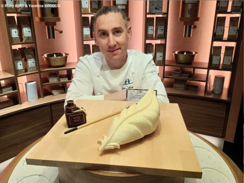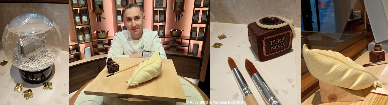 After "Santa's Letterbox," the Trompe-L'oeil "This is a Fir Tree," and "Christmas Night," he enchants us this Year with "Santa's Feather," subtly playing on the Double Meaning of the Word. This Dessert takes the Form of the Bird's Feather, Emblem of the Restaurant Les Belles Perdrix, and is accompanied by an Inkwell containing Château Troplong Mondot Wine, which will reveal a Secret Message signed by Santa.