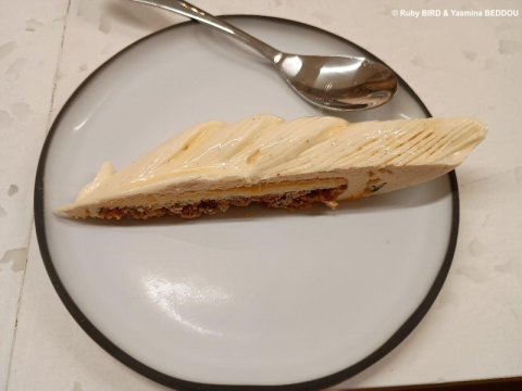 This Dessert, inspired by one of the Restaurant's Menu Offerings, consists of a Vanilla Mousse and a Passion Fruit Caramel Center, with Notes combining Acidity, Freshness, and Lightness. A Crispy Jerusalem Artichoke, with Delicious Aromas, completes this Log with surprising Inventiveness.